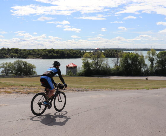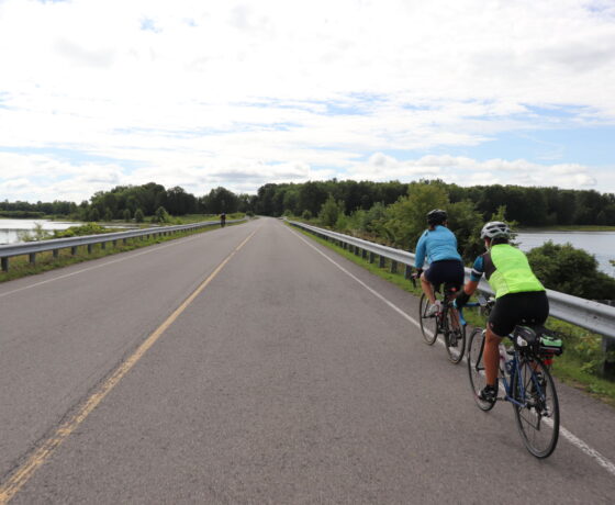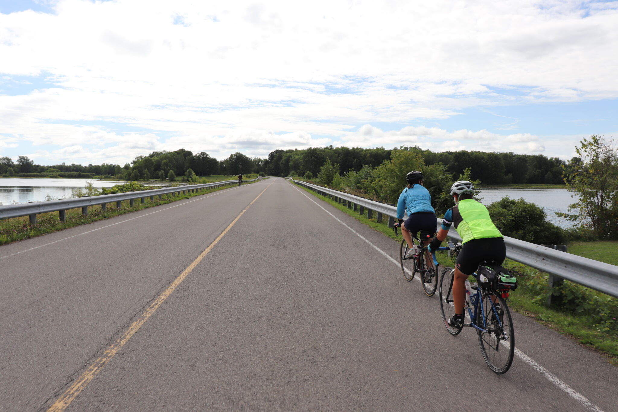 Leaving Oka, we cycle along the north shore to the Carillon dam and then head inland into the the Laurentians. Climbers will have the option of a lovely challenge through a bucolic route surrounded by lakes. Taking the Long-Sault Bridge allows us to jump over Chenail Island and cross over into Ontario. We are in search of better asphalt conditions than what we had in Quebec.
