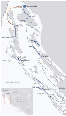 Cet itinéraire emprunte des terrains vallonnés à montagneux avec quelques montées plus raides pouvant atteindre environ 400 mètres. Nécessite une bonne maîtrise du vélo dans les descentes sinueuses, sur l'asphalte irrégulier et parfois sur des chemins de gravier. Distance : 20 à 50 km par jour. Les routes sont principalement goudronnées et peu fréquentées en dehors de la haute saison touristique. Sur l'île de Krk, un court tronçon emprunte des chemins forestiers et des chemins de gravier non goudronnés. Sur l'île de Lošinj, le circuit suit une étroite promenade en bord de mer qui nécessite une conduite prudente et maîtrisée. La circulation peut être dense dans et autour des villes côtières. Certaines sections des îles de Cres et Krk sont également un peu plus fréquentées.